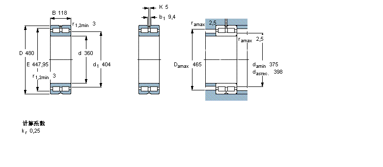 | 圆柱滚子轴承, 双列满装滚子, 无密封件, 双方向轴向负荷的挡边 | ||||||||||