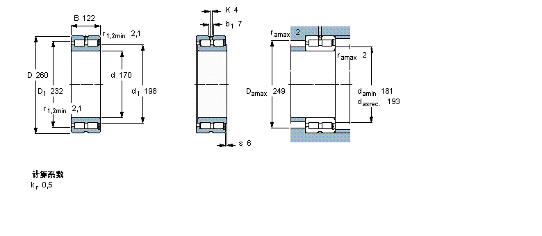| 圆柱滚子轴承, 双列满装滚子, 无密封件, 单方向轴向负荷的挡边 | ||||||||||